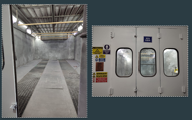 2) 3 metre genişliğinde, 7,5 metre derinliğinde ve 3,5 metre yüksekliğinde olup askılama yoluyla kapalı sistem boya uygulama ve pişirme yapılmaktadır.